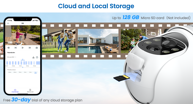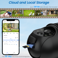 These security cameras wireless outdoor support both SD card and cloud storage for your video footage. New users enjoy 30-days cloud storage trial. You don't have to subscribe to the cloud service to use the camera. The wifi camera accommodates up to 128GB of storage in both FAT32 and exFAT formats.