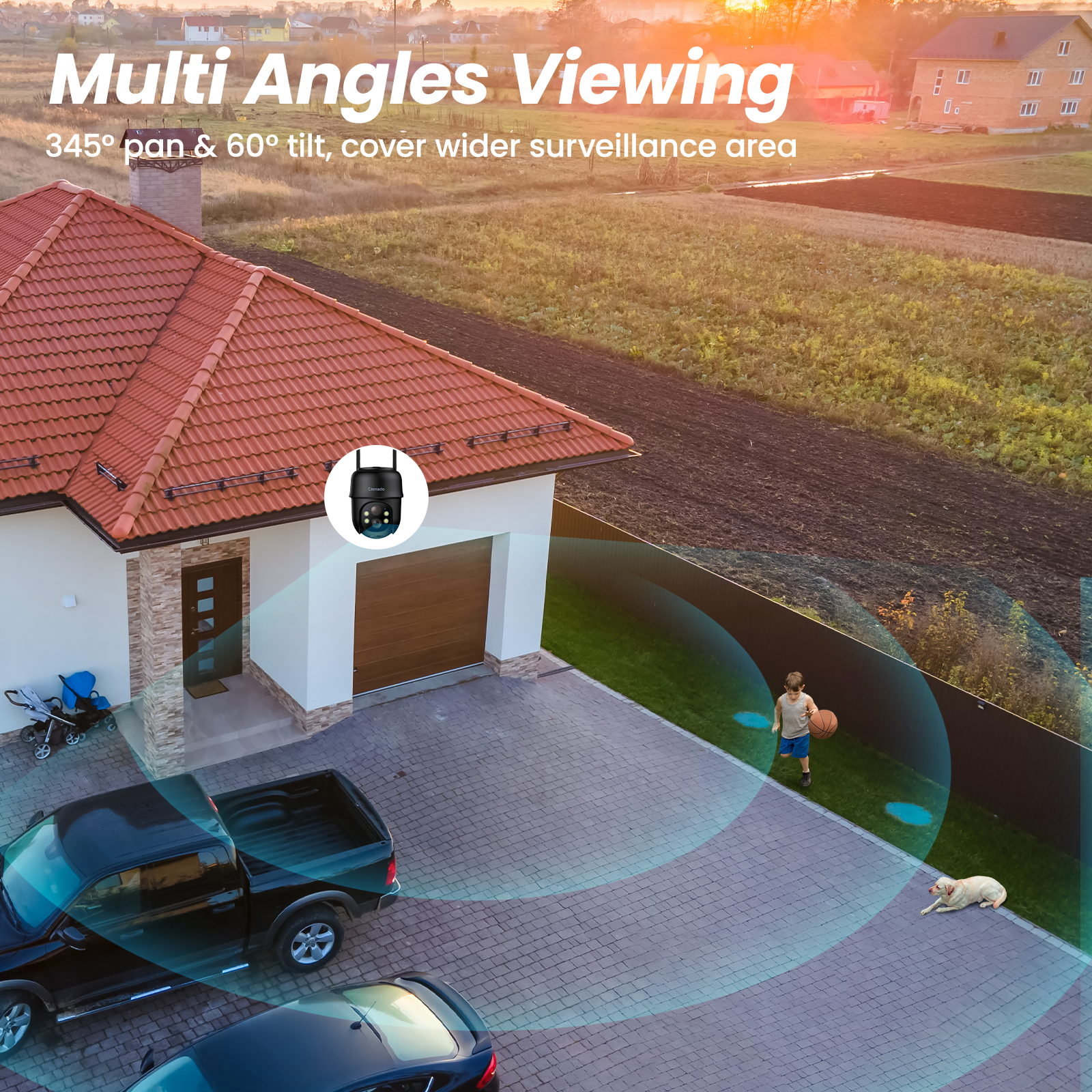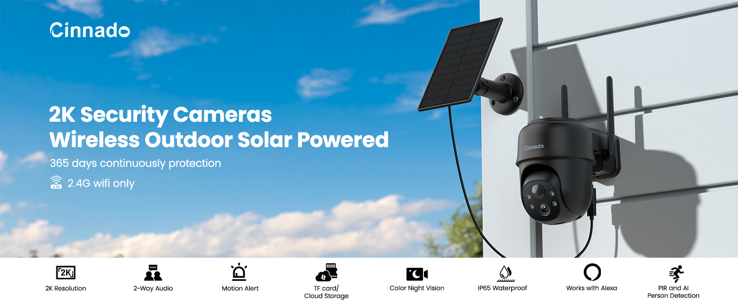 Cinnado Security Cameras Wireless Outdoor-2K Cameras for Home Security Outside Solar/Battery Powered 2.4G WiFi, 360° Color Night Vision, 2 Way Audio, PIR Human Detection, Works with Alexa