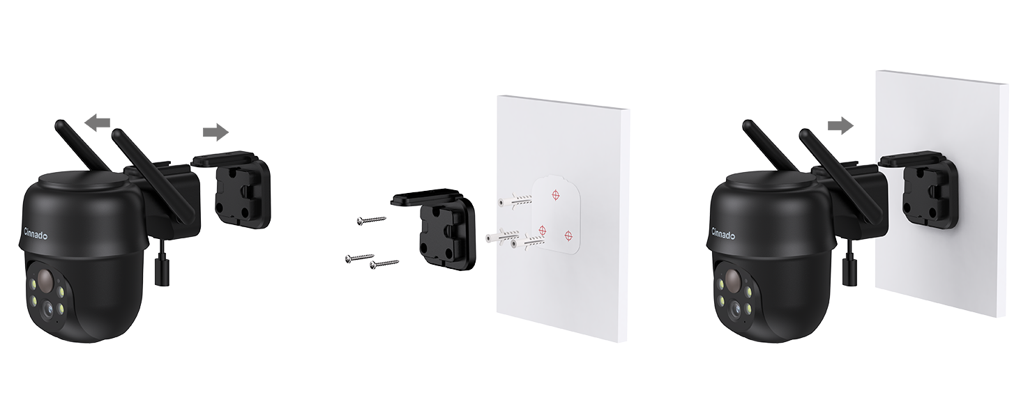 Remove the mounting bracket from the camera. Use the provided hole positioning stickers to mark and drill holes in the wall, secure the base with screws, and plug in the camera to complete the setup. Do not drill into the camera itself.